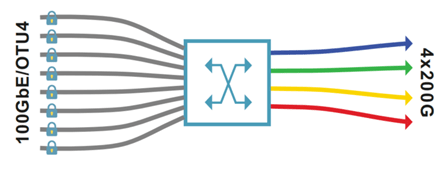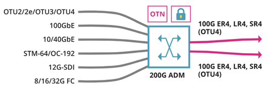 A PL-2000ADS architektúrája: A két 100G-s kimenet (optikai switch modul beillesztésével) redundanciát biztosít, tehát külön nyomvonalakon vihető ki ugyanaz a jel, automatikus, 30-50 miliszekundumon belüli átkapcsolással.