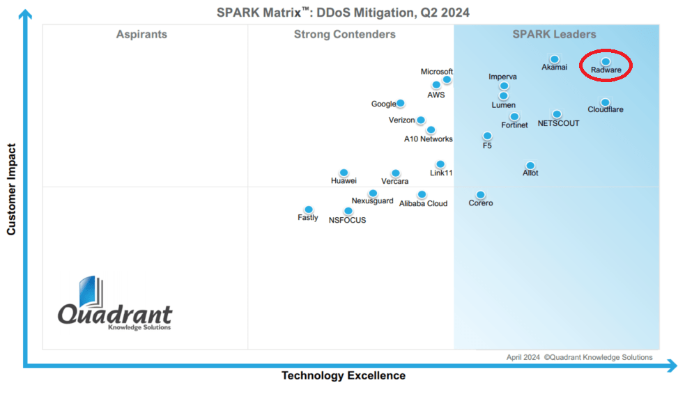 A Quadrant Knowledge Solutions 2024.Q2-es SPARK mátrixában a Radware „Leader” minősítést kapott és minden versenytársát megelőzte a DDoS támadások elleni védekezés területén.