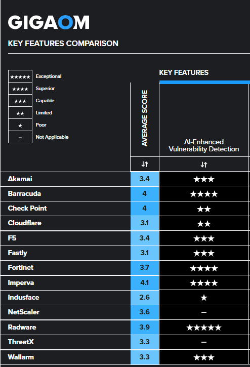 A GigaOm alkalmazás- és API-biztonsági (AAS) elemzésében a Radware egyedüliként a maximális 5 csillagot kapta meg a mesterséges intelligencia alapú sérülékenységészlelés kategóriában.