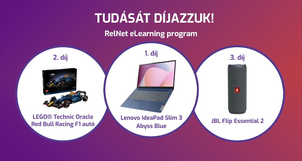 A 2025. december 1-től 2026. március 31-ig tartó RelNet eLearning versenyben a legtöbb pontot megszerző három felhasználónkat egy-egy értékes ajándékkal díjazzuk. A díjak a következők: