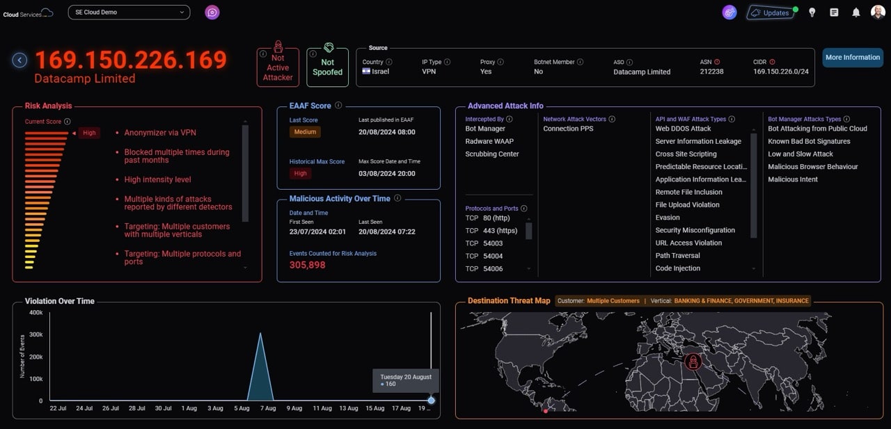 IP Insight – A kibertámadásokban részt vevő IP-címekről nyújt átfogó részleteket: • A kibertámadással kapcsolatos adatok láthatósága, több elfogóeszköz valós idejű gyűjtései alapján• A Radware által blokkolt DDoS (webes és hálózati), WAF, API és bot támadásokban érintett IP-címek