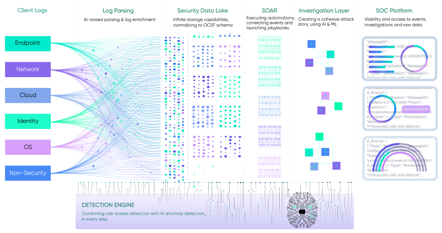 4. Központi igazságforrás: A Security Data Lake alapozza meg a Detection Engine működését, lehetővé téve a szabály alapú és az anomália alapú észlelések párhuzamos futtatását.