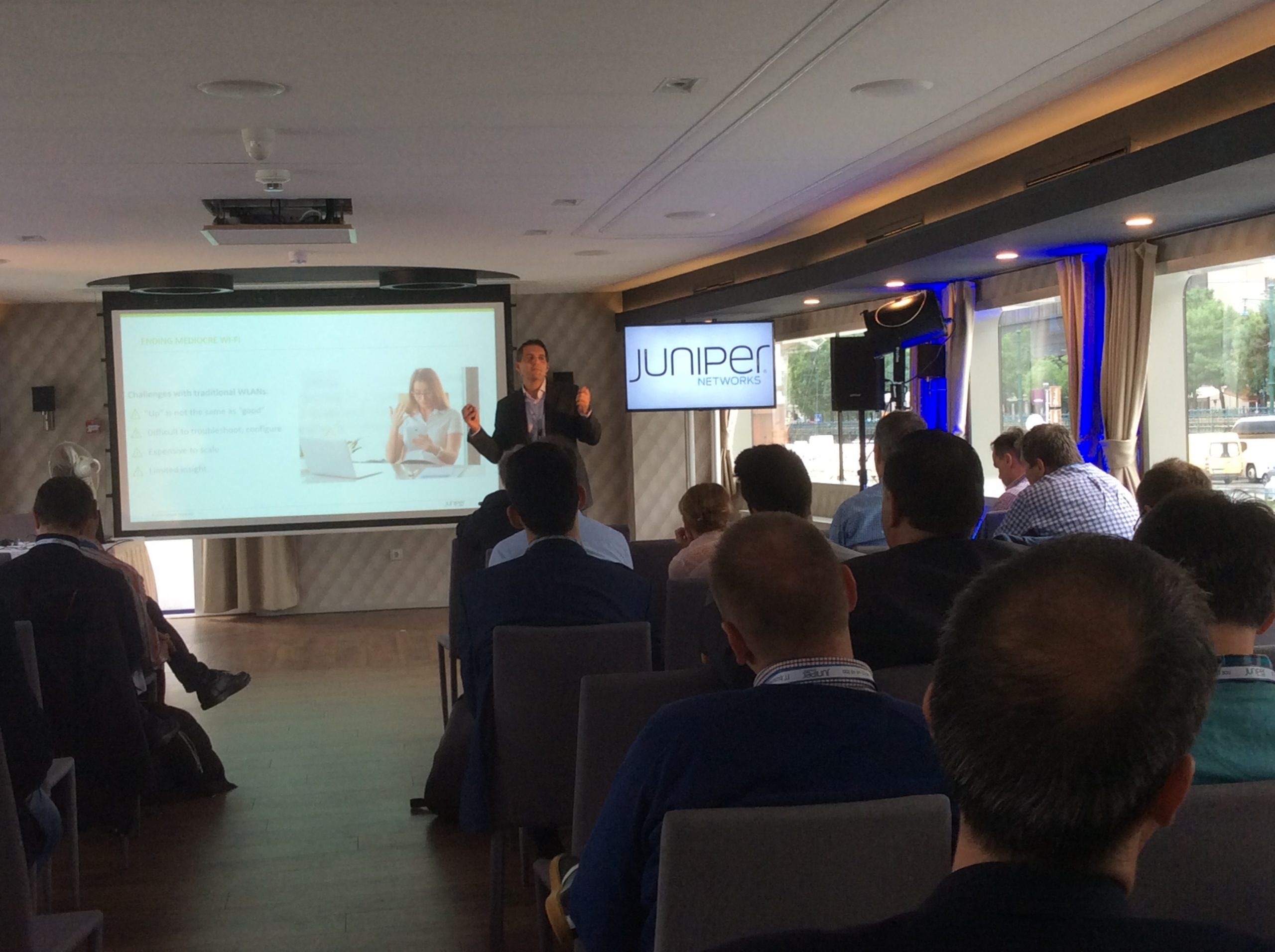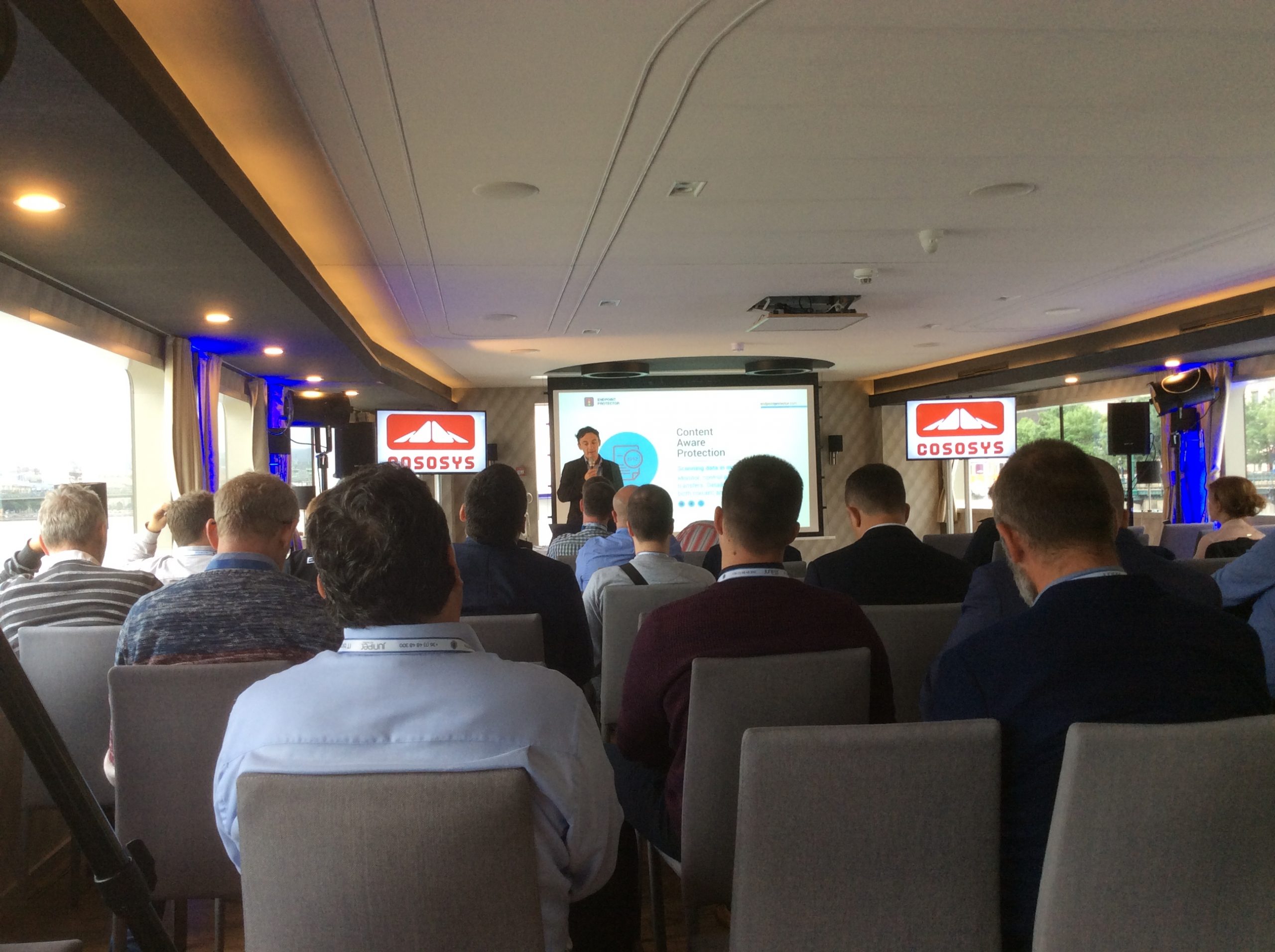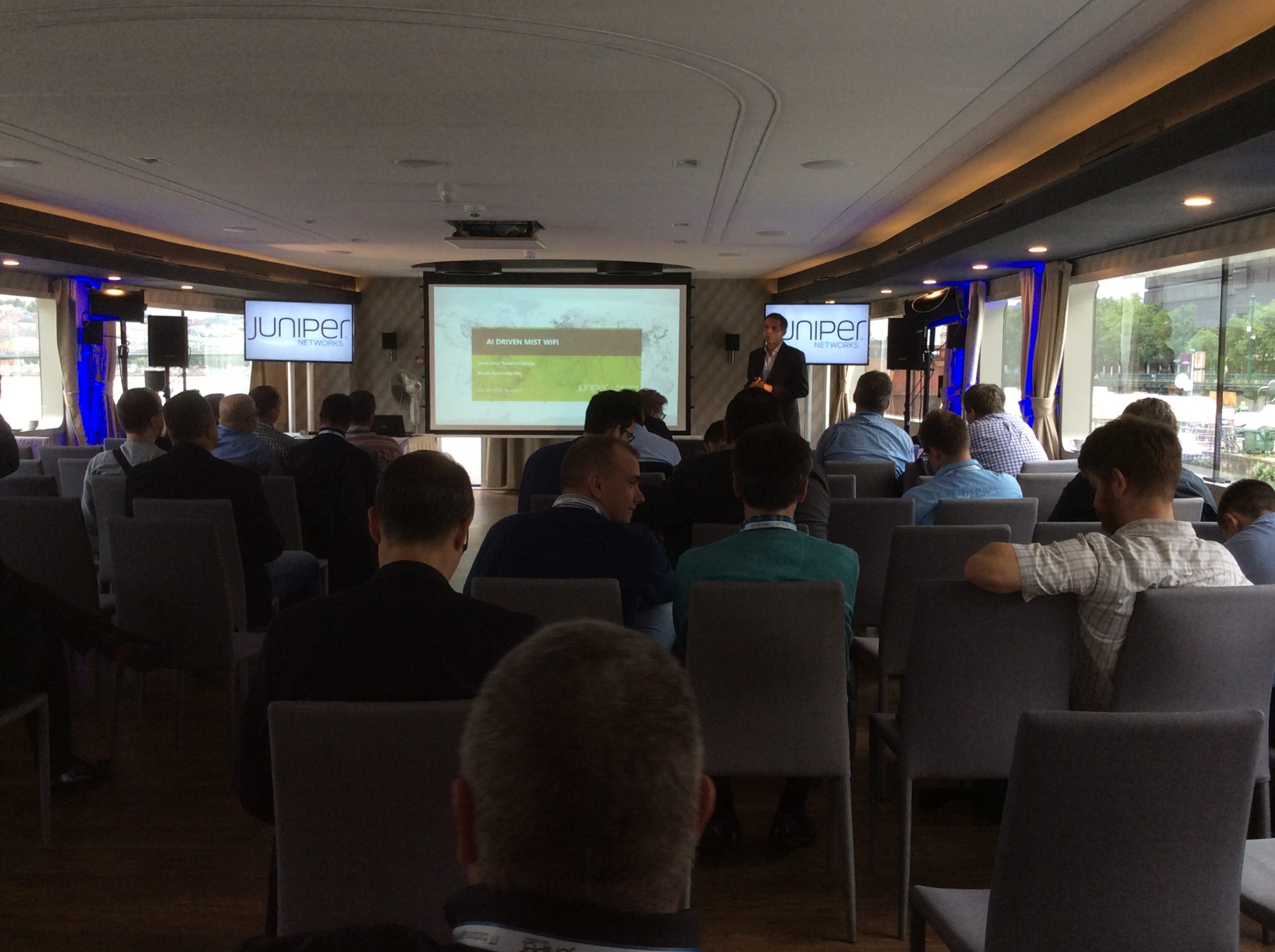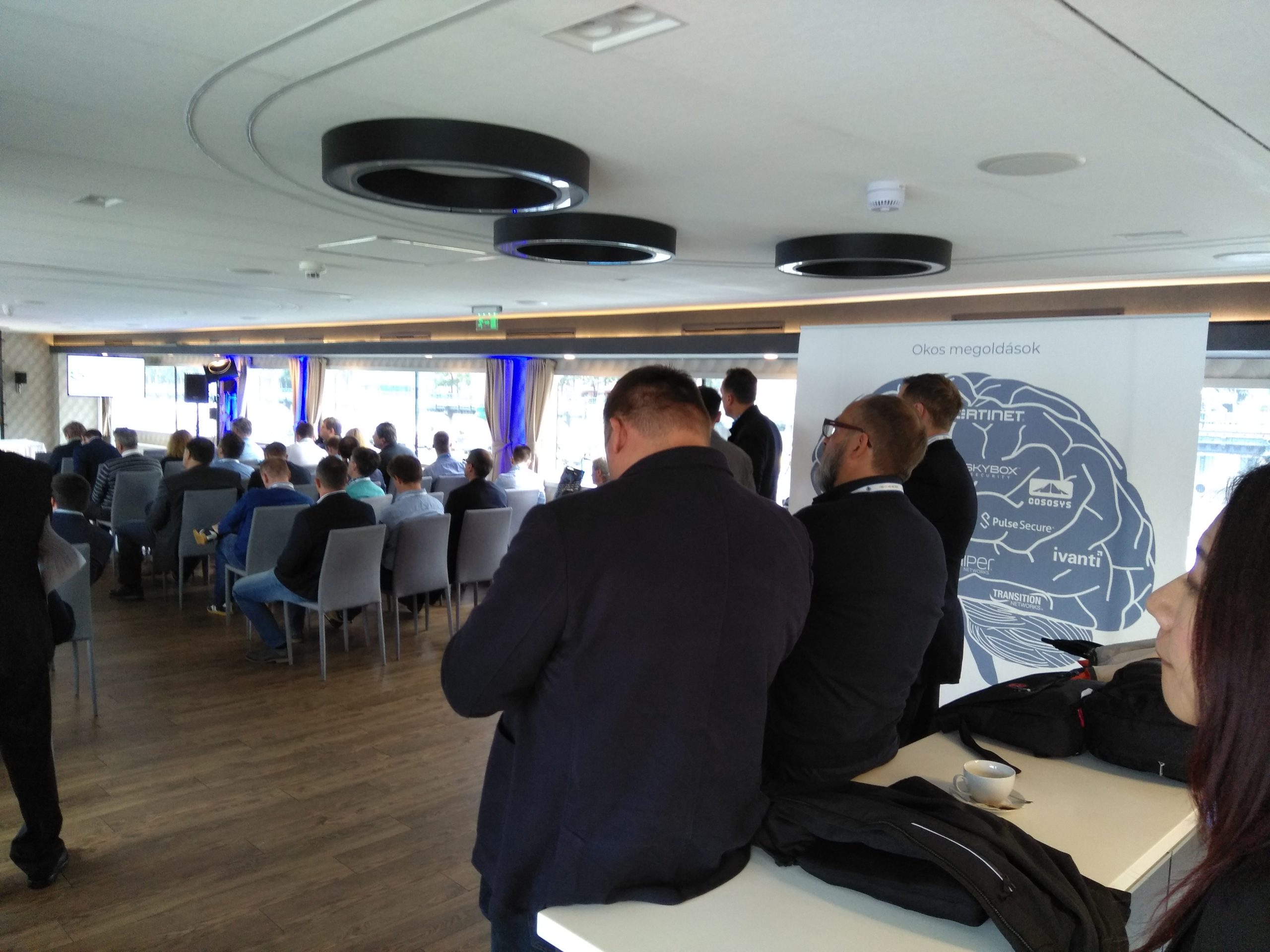A nap Fazakas László vendégelőadásával indult az 1 éves GDPR tanulságairól. Majd gyártóink legfrissebb fejlesztési irányaikat, legújabb termékeiket mutatták be partnereinknek. Michal Zlesak előadása az Autonóm nagyvállalatokról szólt. Az Extreme Networks szerint a jövő nagyvállalati hálózatainak menedzselésében a mesterséges intelligenciának kiemelkedően fontos szerepe lesz. A Skybox előadása a kiberfenyegetések egyszerű menedzsmentjét mutatta be rávilágítva, hogy hogyan tudjuk kiszűrni ki azokat a sérülékenységeket, melyekre figyelni kell. Thomas Mammitzsch (Pulse Secure) prezentációja a hibrid hozzáférés biztosításáról szólt a szoftver által meghatározott határvonalon keresztül. Az SSH előadásából megismerhettük a Lean Cloud és Just-In-Time hozzáféréskezelést a hibrid felhőmegoldások esetén. A Kemp Technologies bemutatta, hogyan lehet optimalizálni és védelmet biztosítani költségcsökkentés és magas rendelkezésre állás mellett az ADC technológia segítségével. A CTS esettanulmányából az ipari Ethernet Secure Fast Ring applikációját ismerhettük meg a Haifa Cable Car projekten keresztül. Szalai Tamás a CoSoSys Endpoint Protector megoldásával mutatta meg hogyan derítsük fel, tartsuk ellenőrzésünk alatt és védjük érzékeny adatainkat. A Panda Security előadása a GDPR-nak való megfelelést mutatta be a gyakorlatban. Megtudhattuk, hogy a Panda Data Control segítségével miként lehet megvalósítani a folyamatos adatleltárt, az egyszerű keresést a különböző adatbázisokban, a riasztások, monitorozások és fájlműveleti információk állandó szem előtt tartásával. A Juniper előadása az új Wi-Fi megoldásáról a MIST-ről szólt, amely a mesterséges intelligencia alkalmazásával igyekszik a hálózatautomatizálás problémáját megoldani Wi-Fi integrációval.